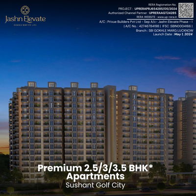 Jashn Elevate Apartments : Jashn Elevate is an aspirational gated residential community in the heart of Lucknow, thoughtfully crafted for those who seek a refined lifestyle with comfort, space, and modern conveniences. The project offers elegantly designed 3 BHK apartments with super-spacious balconies, ensuring an elevated living experience with uninterrupted views and ample outdoor space. The newly launched Club Towers under Phase 2 introduce an exclusive collection of 2 BHK, 3 BHK, and 3.5 BHK residences, designed to meet the evolving needs of modern families. Each apartment is finely planned and equipped with modular kitchens, video door phones, imported flooring, and premium specifications. The well-planned layouts ensure palatial living spaces with abundant ventilation and natural light, creating homes that feel open, airy, and luxurious.